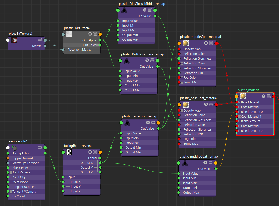 One thing to note is that the facingRatio attribute from the samplerInfo node does not output a perfectly linear result. To get a more accurate ramp of the values from the front-facing angles to the side-facing angles, there would be a need for another adjustment curve to be applied, before the result is plugged into the custom remapValue node. This can be done with another remapValue node. However, I chose not to bother with it, as the change isn’t huge. I would only bother with it if I need absolute accuracy in reproducing specific material properties. In the large majority of cases, I have to make subjective visual adjustments anyway.